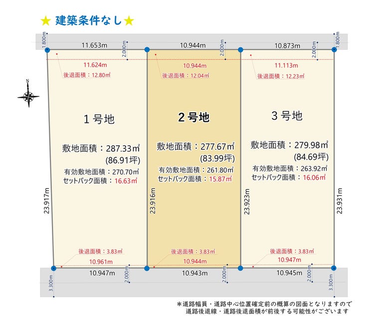 | 土地面積 | 実277.67㎡(83.99坪) | 接道 | 南側(公道)幅 約3.3m 間口 約10.94m 北側(公道)幅 約1.8m 間口 約10.94m |